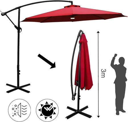- CROSS BASE: With a heavy duty steel cross base for stability, but we would really recommend that you'd better use another heavy base or fix the base on the ground make your offset umbrella more stability.