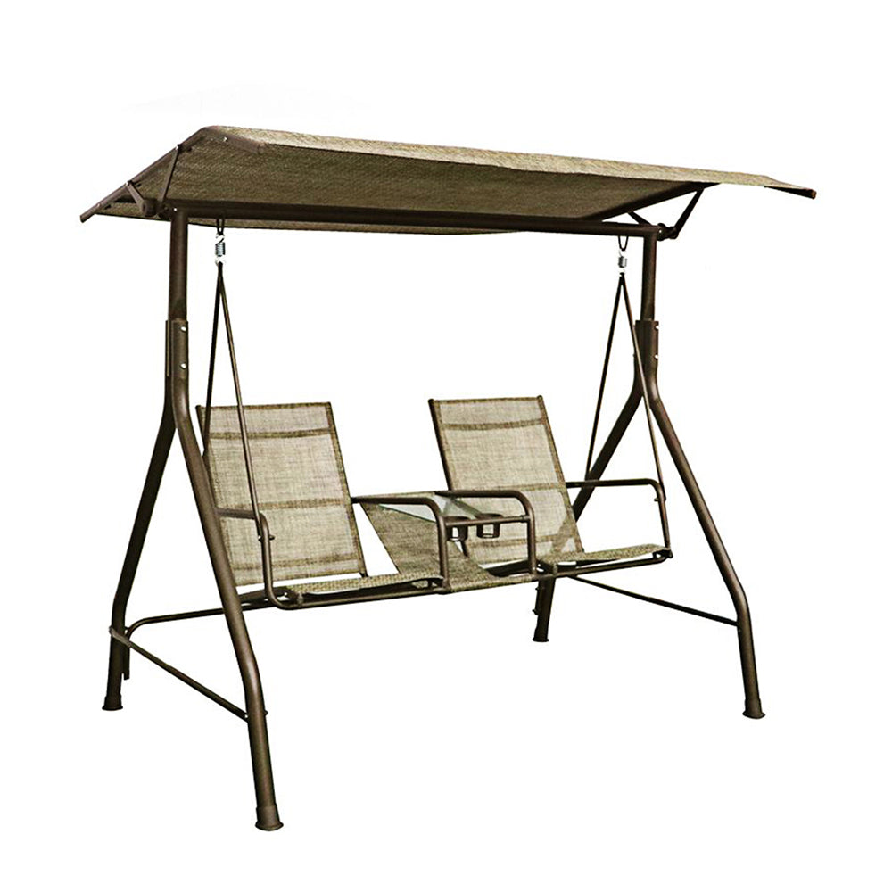Topped with an adjustable canopy, it provides ample shade to shield you from harsh sunlight, so you can enjoy leisurely afternoons or cozy evenings with a loved one. The built-in center table with cup holders adds convenience, keeping your drinks and small items within easy reach.