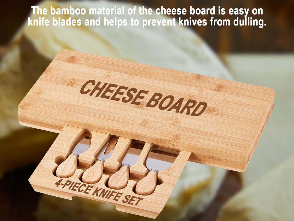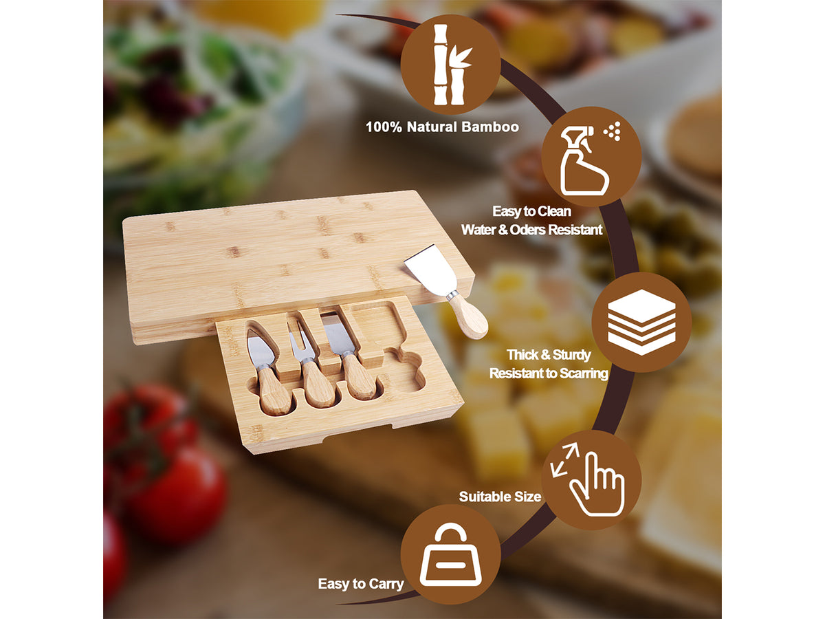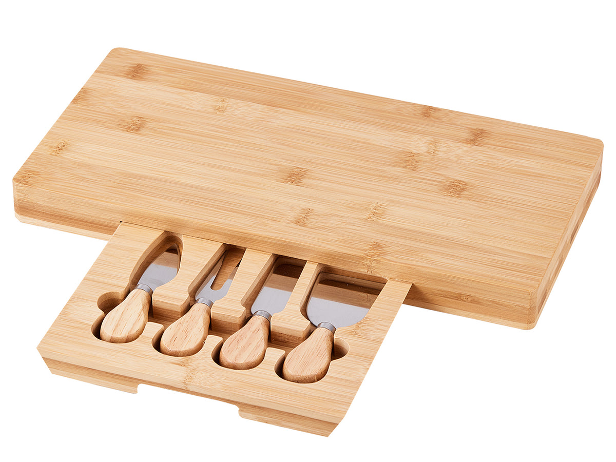 - The hidden slide-out drawer holds 4 stainless steel cheese knives (cheese knife, slicer, fork-tipped knife, and spreader) with matching bamboo handles.