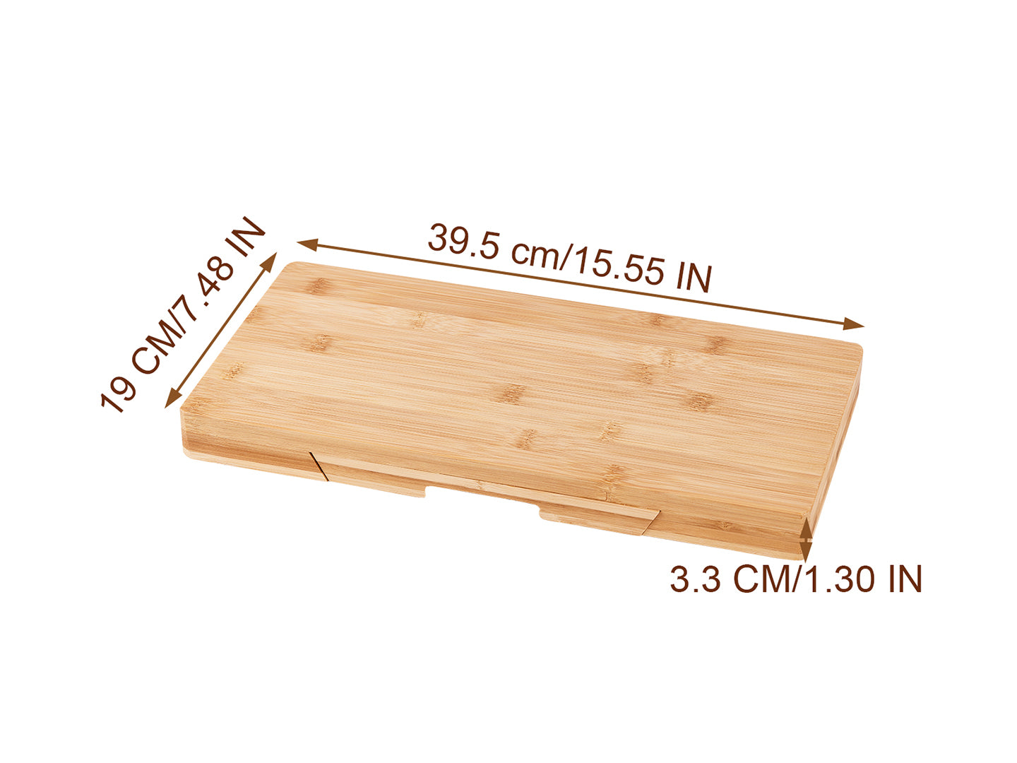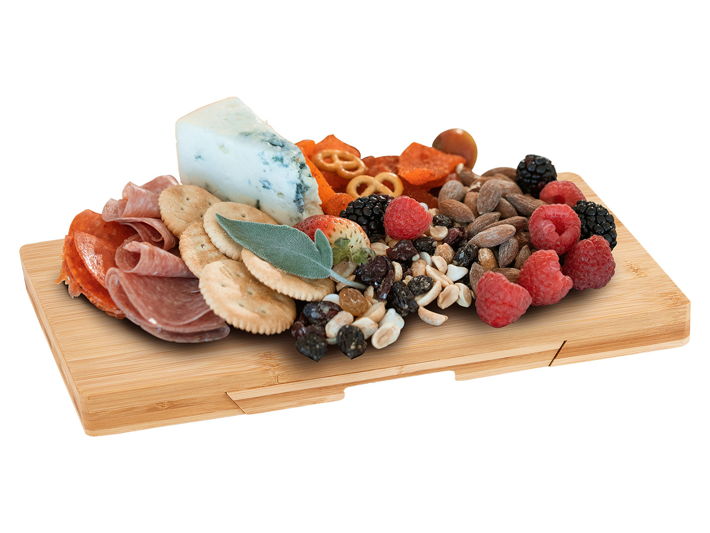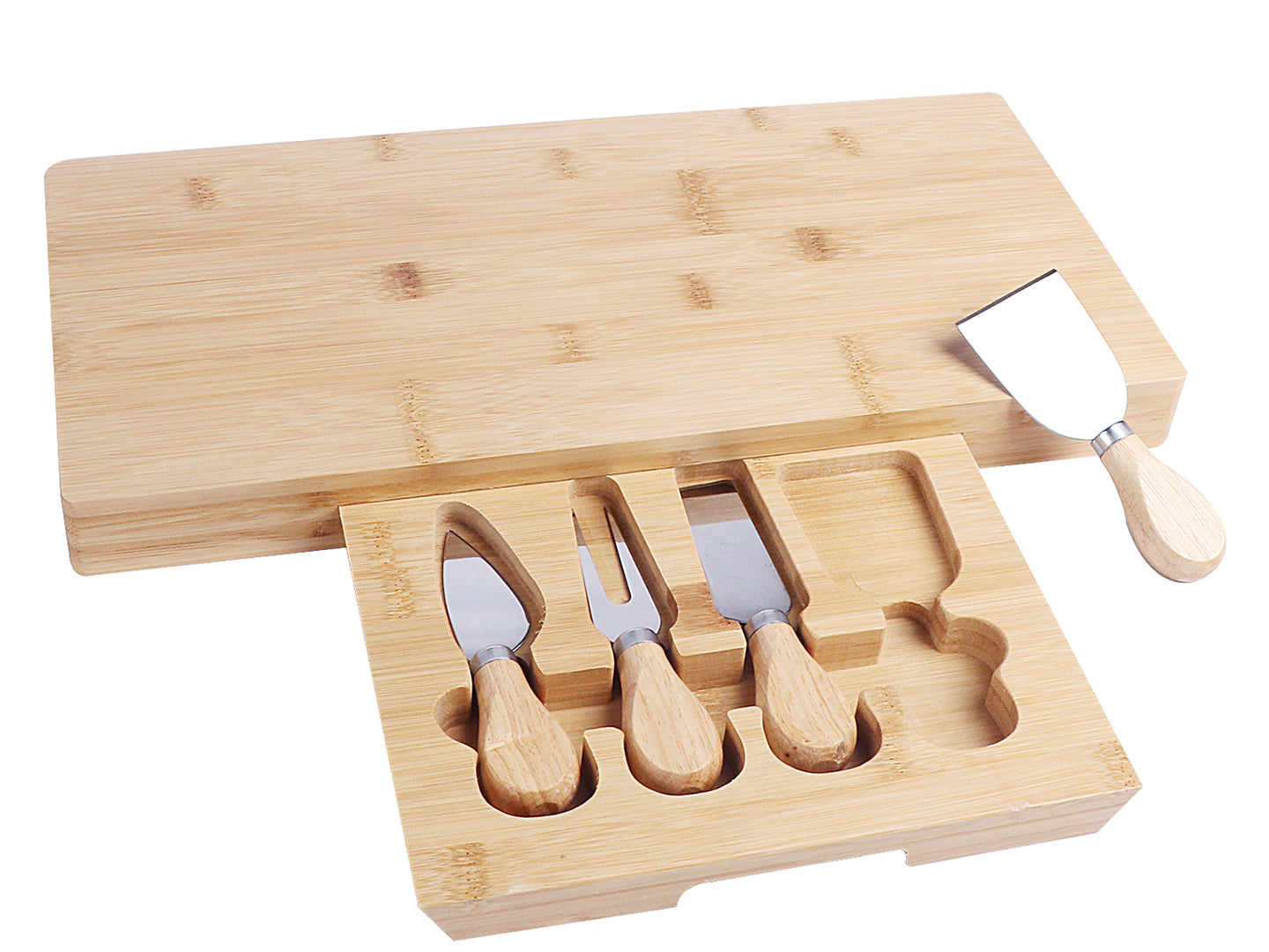 - The hidden slide-out drawer holds 4 stainless steel cheese knives (cheese knife, slicer, fork-tipped knife, and spreader) with matching bamboo handles.