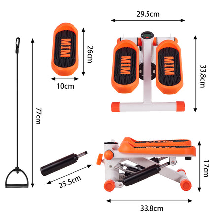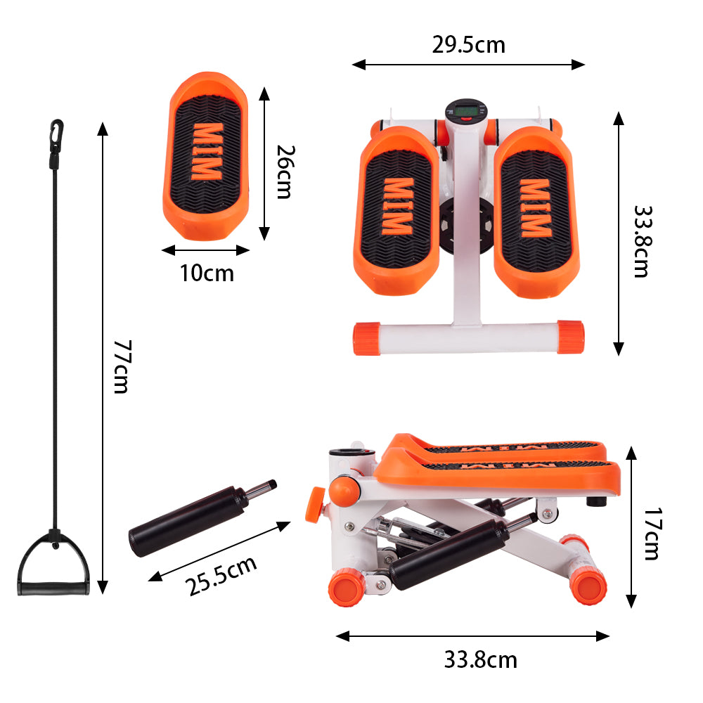 Parcel Dimensions: 14 x 9x 16in; 12 lbs Color: Orange Display Type: LED Screen Material: Metal Item Weight: 12 lbs Package Content: 1 x Mini stepper (accessories and tools) 1 x User manual of stepper exercise machine