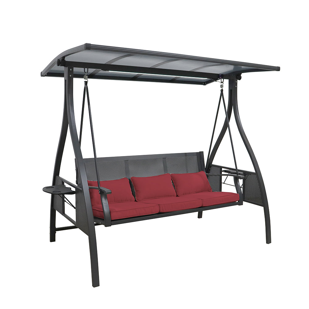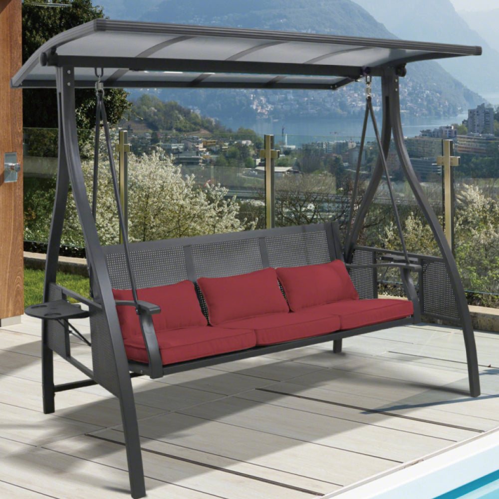 Outdoor 3-Seat Patio Swing with Canopy, Metal Porch Swing Chair with Red Cushions & Side Table, Weather-Resistant for Garden, Backyard, Deck