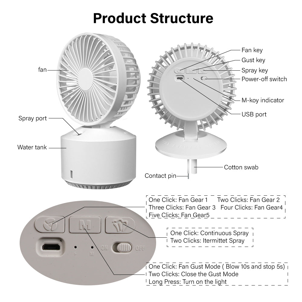 - 【Portable Design】Excellent design and high-quality materials add a sense of fashion. The size of the spray fan is 4.3 inches (length) X5.2 inches (width) X 8.6 inches (height), and the weight is only 0.93 pounds. Small in size, it is convenient for you to take with you when camping and fishing outdoors. This portable fan has a base and can stand on a table, so it can also be used in offices and homes.